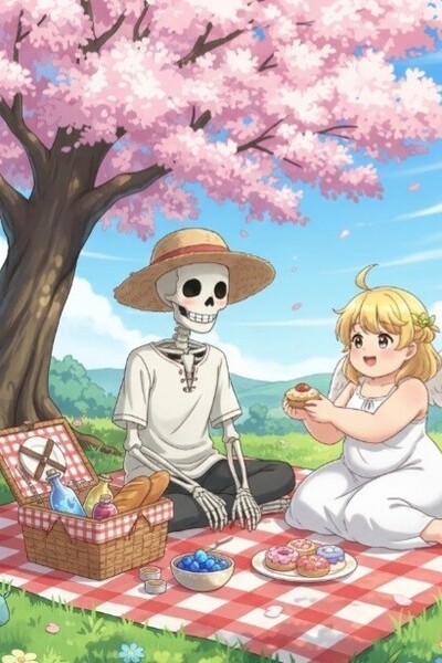 In a land governed by two goddesses, a war has erupted. For the past hundred years the two sister goddesses have commanded their armies to battle against one another. For the most part the battle has been at a stand still, however things start to change. This change wasn’t ushered in by the birth of a new hero or the creation of a powerful demon. It was caused by the odd meeting between a skeleton and a cherub.